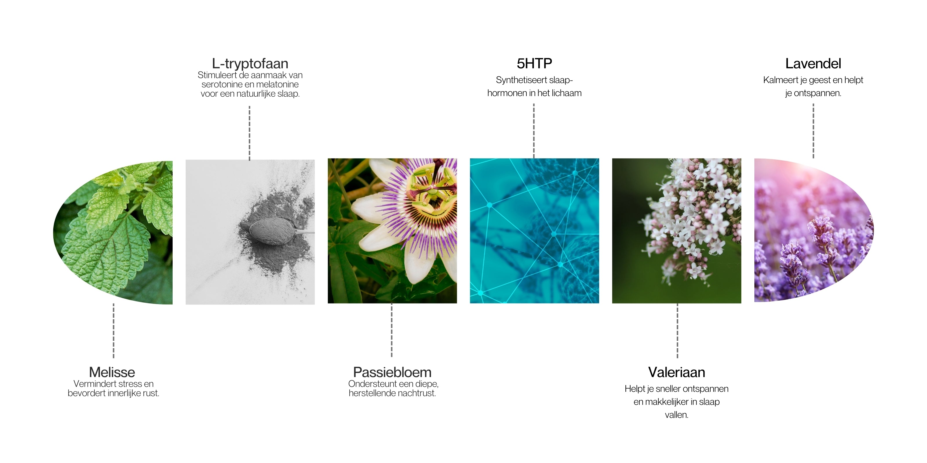 Valeriaan extract 5:1, melisse officinalis extract 5:1, passiebloem extract 5:1, lavendel extract 5:1, l-tryptofaan, kamille extract 5:1, rhodiola extract - met 3% salidroside, Magnesium bisglycinaat, 5-htp, microkristallijn, siliciumdioxide.