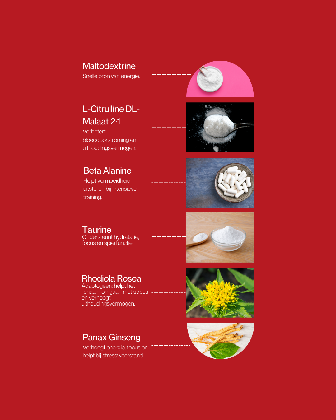 Maltodextrin, l-citrulline dl-malate 2:1, beta alanine, taurine, anti-caking agent: silicon dioxide, acidifier: citric acid, rhodiola rosea extract, flavouring, natural lemon flavouring, natural flavouring, sweetener: sucralose, panax ginseng (root) extract.